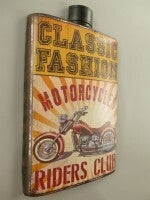 Een uitgestanste metalen plaat in de vorm van een kan, daarover heen een vintage motorcycle print.